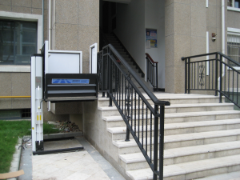 垂直式無障礙升降平臺,主要是由導(dǎo)軌和升降平臺板組成的,類似一個簡易的小電梯。導(dǎo)軌是鑲嵌在通道出入口的墻壁上的,隨著樓梯的坡度向下延伸,一直到地道內(nèi)部。而升降平臺在不使用時可以折疊靠著墻壁放置,這樣不會占用通道出入口處的空間。乘坐輪椅的殘疾人在使用時,輪椅四個輪子可以被固定在臺板上,按動開關(guān)后就可以控制升降平臺進入地下通道,安全方便。