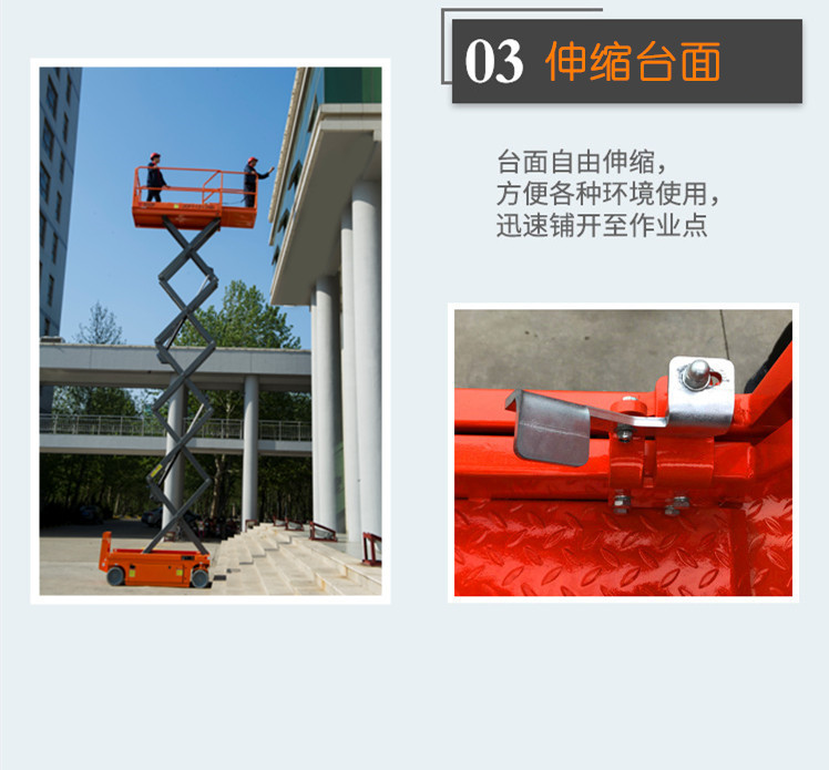 自行式剪叉高空作業(yè)平臺(tái)工作平臺(tái)可移出,擴(kuò)大了工作范圍,可滿足部分用戶的特殊需要。