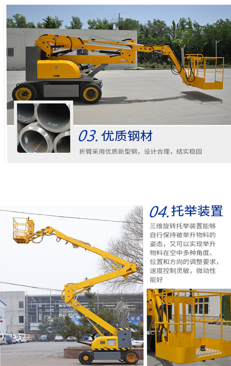 *簡介*:自行曲臂式液壓升降機(jī)是折臂式升降機(jī)的更新?lián)Q代產(chǎn)品。能懸伸作業(yè)、跨越一定的障礙或在一處升降可進(jìn)行多點作業(yè);360度旋轉(zhuǎn),平臺載重量大,可供兩人或多人同時作業(yè)并可搭載一定的設(shè)備;升降高度8-14米不等,升降平臺移動性好,轉(zhuǎn)移場地方便;外型美觀,適用于車站、碼頭、商場、體育場館、小區(qū)物業(yè)、廠礦車間等大范圍作業(yè)。*特點*:采用優(yōu)質(zhì)結(jié)構(gòu)鋼,單面焊接雙面成型工藝,原裝進(jìn)口液壓泵站或國內(nèi)合資液壓泵站,高空作業(yè)升降平臺裝有平衡閥、自動保壓等安全裝置,平臺安全可靠耐用。該系列升降機(jī)具有移動靈活,升降平穩(wěn),載重量大,操作方便等特點,
