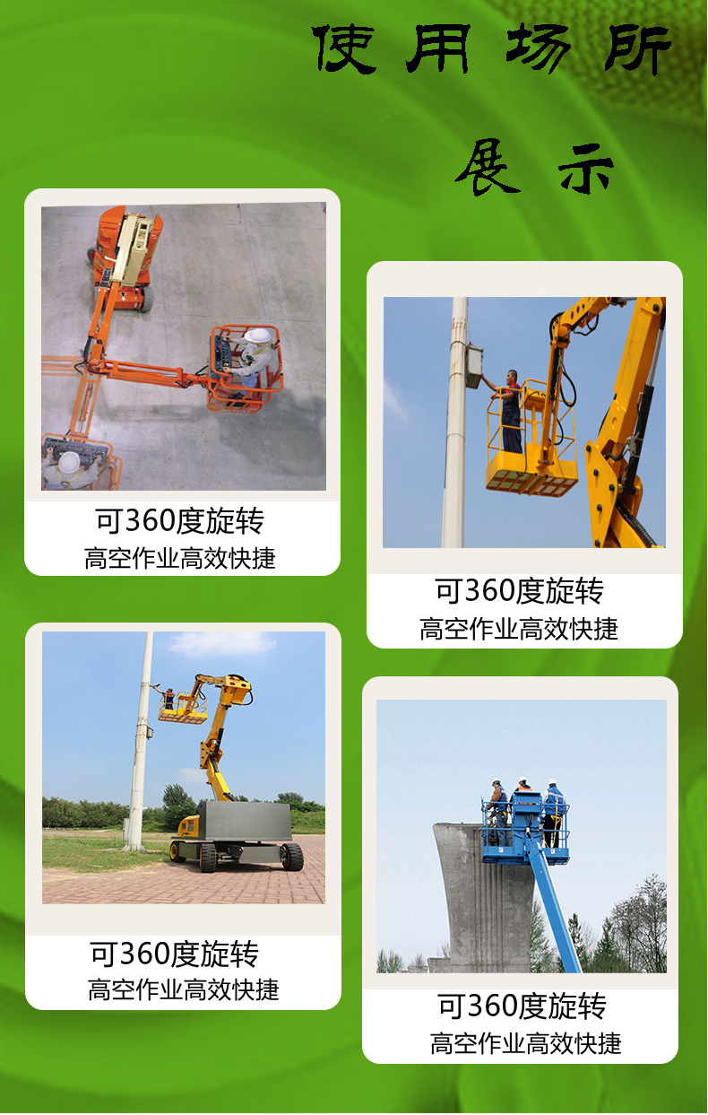 自行曲臂式高空作業(yè)平臺動力分為柴油機(jī)發(fā)動機(jī)型、直流馬達(dá)型,升降臂有二節(jié)、三節(jié)、升降高度從10米至32米、所有機(jī)型全高度行走、曲臂延伸升降、轉(zhuǎn)盤360°旋轉(zhuǎn)。自行曲臂式高空作業(yè)平臺,操作簡單,使用方便,作業(yè)面大。供室外高空作業(yè)使用;在平臺上方就可控制設(shè)備升降行走,能夠跨越一定障礙或在一處升降可進(jìn)行多點高空作業(yè)。